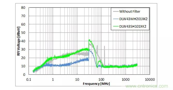【導(dǎo)讀】支持CAN、FlexRay的DLW43SH101XK2在有些頻率下噪聲會增加,降噪效果不佳,但使用支持100Base-T1的DLW43MH201XK2能有效地降噪。