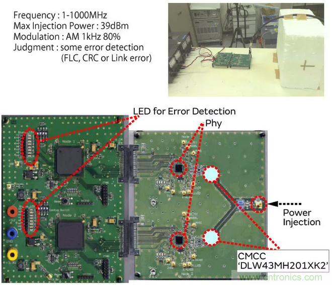 進(jìn)行DPI(Direct Power Injection)試驗,確認(rèn)了共模扼流圈的抗擾性改善效果。