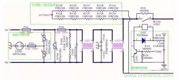 上面的電路對(duì)EMC的影響可想而知,輸入端的濾波器都在這里;防雷擊的壓敏;防止沖擊電流的電阻R102(配合繼電器減小損耗);關(guān)鍵的慮差模X電容以及和電感配合濾波的Y電容;還有對(duì)安規(guī)布板影響的保險(xiǎn)絲;這里的每一個(gè)器件都至關(guān)重要,要細(xì)細(xì)品味每一個(gè)器件的功能與作用。設(shè)計(jì)電路時(shí)就要考慮的EMC嚴(yán)酷等級(jí)從容設(shè)計(jì),比如設(shè)置幾級(jí)濾波,Y電容數(shù)量的個(gè)數(shù)以及位置。壓敏大小數(shù)量選擇,都與我們對(duì)EMC的需求密切相關(guān),歡迎大家一起討論看似簡(jiǎn)單其實(shí)每個(gè)元器件蘊(yùn)含深刻道理的EMI電路。