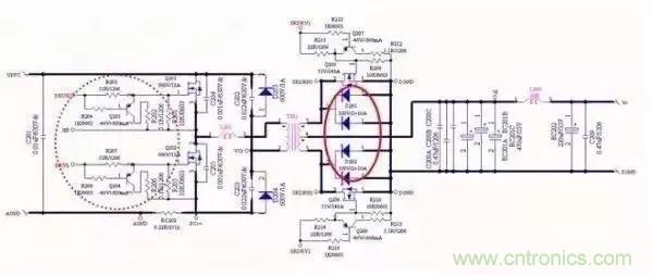 LLC電路大家最熟悉不過(guò)了,虛線圓圈是驅(qū)動(dòng)電路,在電路設(shè)計(jì)時(shí)緊靠MOS管放置,也就是說(shuō)IC提供的驅(qū)動(dòng)只需要引二根線拉到驅(qū)動(dòng)電路,驅(qū)動(dòng)電路離MOS管近,避免被干擾(同時(shí)走線時(shí)也要注意驅(qū)動(dòng)干擾到敏感信號(hào),既是敏感信號(hào)也是干擾源);一旦驅(qū)動(dòng)被干擾電源可想而知。