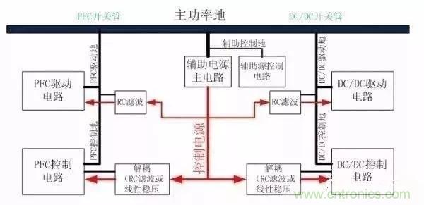 2.DC-DC部分的驅(qū)動(dòng)地和控制地接DC開(kāi)關(guān)管部分的采樣地;