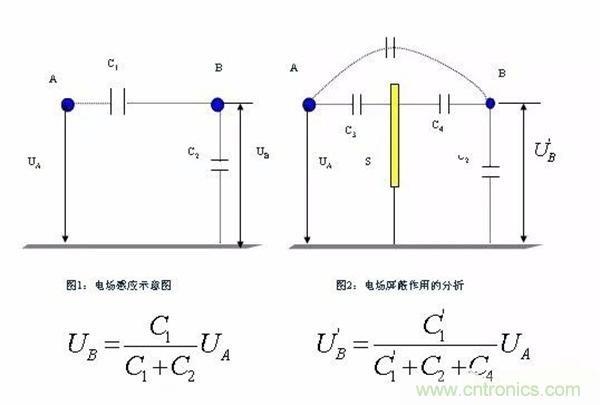 如圖對(duì)照:輸入和輸出的電場(chǎng)干擾可以通過(guò)電容傳輸耦合,若增加屏蔽板,則增加了C4的大小,并且C1也會(huì)減小,對(duì)電場(chǎng)干擾起到衰減的目的;