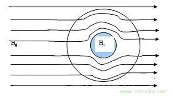磁場(chǎng)屏蔽原理,磁場(chǎng)通過(guò)屏蔽罩會(huì)改變磁路,導(dǎo)致磁力線向周圍擴(kuò)散,中間磁場(chǎng)干擾達(dá)到屏蔽目的;