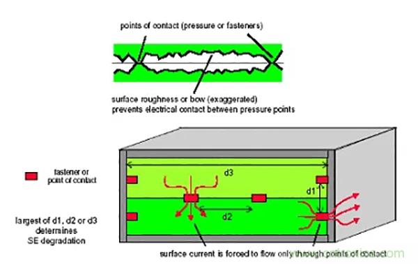 d、屏蔽體的電連續(xù)性是影響結(jié)構(gòu)件屏蔽效能最主要的因素,相對而言,一般材料本身屏蔽性能以及材料厚度的影響是微不足道的(低頻磁場例外);