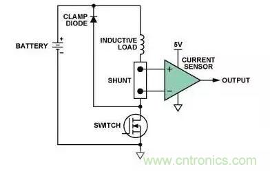 本例將詳細介紹一種典型的高端電流檢測應(yīng)用。圖1所示為汽車應(yīng)用環(huán)境中用于監(jiān)控電磁閥或其它感性負(fù)載的常見配置。