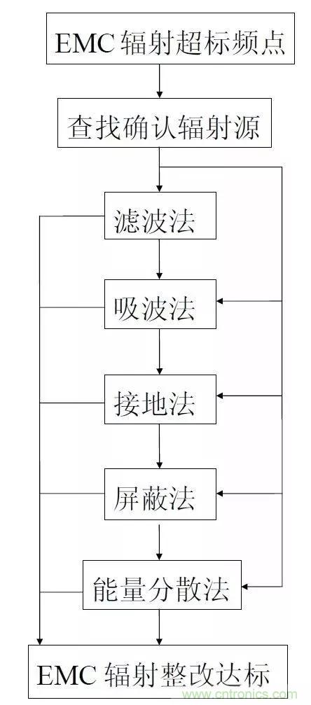 EMC 整改六步法如下:第一步查找確認(rèn)輻射源,第二步濾波,第三步吸波,第四步接地,第五步屏蔽,第六步能量分散法。具體思路如下圖所示: