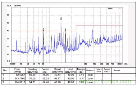 某行車記錄儀,測試的時候要加一個外接適配器,在機器上電運行測試時發(fā)現(xiàn)超標,具體頻點是84MHZ、144MH、168MHZ,需要分析其輻射超標產(chǎn)生的原因,并給出相應(yīng)的對策。輻射測試數(shù)據(jù)如下: