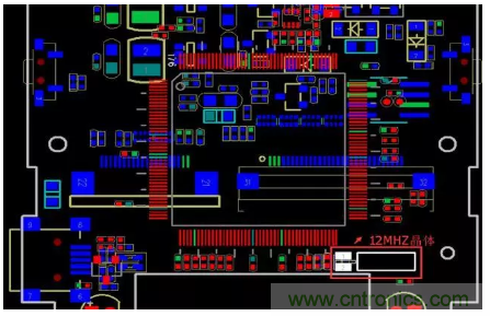 該產(chǎn)品只有一塊PCB,其上有一個12MHZ的晶體。其中超標頻點恰好都是12MHZ的倍頻,而分析該機器容易EMI輻射超標的屏和攝像頭,發(fā)現(xiàn)LCD-CLK是33MHZ,而攝像頭MCLK是24MHZ;通過排除發(fā)現(xiàn)去掉攝像頭后,超標點依然存在,而通過屏蔽12MZH晶體,超標點有降低,由此判斷144MHZ超標點與晶體有關(guān),PCB布局如下: