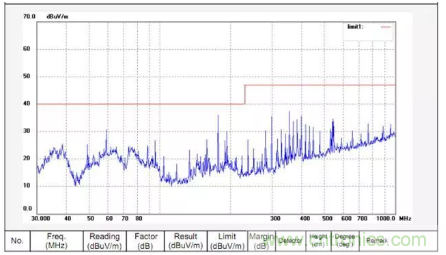 將晶振內(nèi)移,使其離PCB邊緣至少1cm以上的距離,并在PCB表層離晶振1cm的范圍內(nèi)敷銅,同時把表層的銅通過過孔與PCB地平面相連。經(jīng)過修改后的測試結(jié)果頻譜圖如下,從圖可以看出,輻射發(fā)射有了明顯改善。