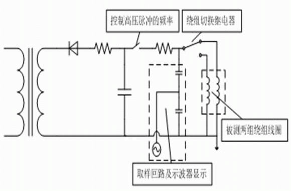 目前市面上有不少專用的繞組匝間沖擊耐電壓測試儀,這類匝間沖擊耐電壓測試儀產(chǎn)品的基本原理都是以同型號繞組感抗相等為前提,采用波形比較法,以高壓脈沖對等效過電壓、無損模擬試驗。然后通過示波器這樣的裝置通過完全一致的取樣回路來測量這個脈沖在繞組線圈中的振蕩波形,如果兩個波形不一致,那么表明這兩組線圈中至少有一組存在匝間短路的故障。其測量原理圖如下: