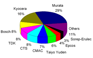 LTCC技術(shù)最早由美國開始發(fā)展,初期應(yīng)用于軍用產(chǎn)品,后來歐洲廠商將其引入車用市場,而后再由日本廠商將其應(yīng)用于資訊產(chǎn)品中。目前,LTCC材料在日本、美國等發(fā)達國家已進入產(chǎn)業(yè)化、系列化和可進行材料設(shè)計的階段。在全球LTCC市場占有率九大廠商之中,日商有Murata,Kyocera,TDK和Taiyo Yuden;美商有CTS,歐洲商有Bosch, CMAC,Epcos及Sorep-Erulec等。國外廠商由于投入已久,在產(chǎn)品質(zhì)量,專利技術(shù)、材料掌控及規(guī)格主導(dǎo)權(quán)等均占有領(lǐng)先優(yōu)勢。圖1給出全球LTCC廠商市場占有情況。而國內(nèi)LTCC產(chǎn)品的開發(fā)比國外發(fā)達國家至少落后五年,擁有自主知識產(chǎn)權(quán)的材料體系和器件幾乎是空白。國內(nèi)目前LTCC陶瓷材料基本有兩個來源:一是購買國外陶瓷生帶;二是LTCC生產(chǎn)廠從陶瓷材料到生帶自己開發(fā)。隨著未來LTCC制品市場中運用LTCC制作的組件數(shù)目逐漸被LTCC模塊與基板所取代,終端產(chǎn)品產(chǎn)能過剩,價格和成本競爭日趨激烈,元器件的國產(chǎn)化必將提上議事日程,這為國內(nèi)LTCC產(chǎn)品的發(fā)展提供了良好的市場契機。中國在LTCC市場占據(jù)一定份額的是疊層式電感器和電容器生磁帶。目前,清華大學材料系、上海硅酸鹽研究所等單位正在實驗室開發(fā)LTCC用陶瓷粉料,但還尚未到批量生產(chǎn)的程度。南玻電子公司正在用進口粉料,開發(fā)出介電常數(shù)為9.1、18.0和37.4的三種生帶,厚度從10µm到100µm,生帶厚度系列化,為不同設(shè)計、不同工作頻率的LTCC產(chǎn)品的開發(fā)奠定了基礎(chǔ)。國內(nèi)現(xiàn)在急需開發(fā)出系列化的、擁有自主知識產(chǎn)權(quán)的LTCC 瓷粉料,并專業(yè)化生產(chǎn)LTCC用陶瓷生帶系列,為LTCC產(chǎn)業(yè)的開發(fā)奠定基礎(chǔ)。