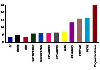 材料的許多熱機械性能也是影響LTCC器件可靠性的一個主要因素,其中最關(guān)健的是熱膨脹系數(shù),應(yīng)盡可能與其要焊接的電路板相匹配。圖4是IC封裝的各材料的熱膨脹系數(shù)。LTCC、氧化鋁和其他陶瓷材料的TCE接近Si、砷化鎵及磷化銦的TCE值,從而可以減小機械應(yīng)力,應(yīng)用在大尺寸的晶片上不需要使用有機疊層。同時,減小熱不匹配性可以增強機械的整體性,降低溫度特性的變化,以及增加數(shù)位、光學和電子技術(shù)的集成能力。