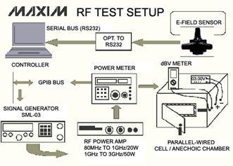 Maxim的RF測(cè)試裝置(圖2)產(chǎn)生用于測(cè)試RF抗干擾能力的RF場(chǎng)。測(cè)試電波暗室具有一個(gè)屏蔽室,作用與法拉第腔的屏蔽室類似,具有連接電源和輸出監(jiān)視器的端口。把下面列舉的設(shè)備連接起來(lái)就可以組成測(cè)試裝置: