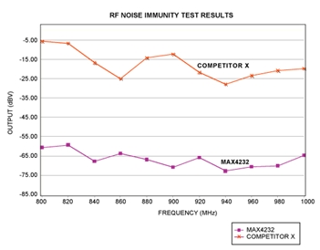 而器件X的噪聲抑制平均讀數(shù)僅有-18dBV,這意味著在RF影響下輸出變化為125mVRMS (相對(duì)于1V)。這個(gè)增加值很大,是正常值50µVRMS的2500倍。因此,器件X的RF抗干擾能力很差(-18dBV),當(dāng)靠近蜂窩電話或其它RF源時(shí)可能無(wú)法正常工作。顯然,對(duì)于音頻處理應(yīng)用如耳機(jī)放大器和話筒放大器,MAX4232是一個(gè)更好的選擇。