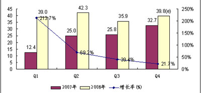 賽迪顧問數(shù)據(jù)顯示,2007年中國PND市場一路飆升,2008年仍保持了平穩(wěn)快速增長,前三季度市場銷售量達(dá)到117.2萬臺,同比增長率為85.5%。盡管宏觀經(jīng)濟(jì)環(huán)境低迷,進(jìn)入第四季度PND傳統(tǒng)旺季,PND市場仍表現(xiàn)優(yōu)異,銷量將超過第三季度實現(xiàn)環(huán)比增長。 圖1 2007~2008年中國PND市場銷售量對比