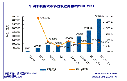 據(jù)易觀國際(Analysys International)最新報(bào)告《中國手機(jī)游戲市場趨勢預(yù)測2008-2011》研究結(jié)果顯示:2011年中國手機(jī)游戲(本文手機(jī)游戲范疇均為基于JAVA和BREW技術(shù)開發(fā)的手機(jī)游戲)市場規(guī)模將達(dá)到42億元,從2003年到2011年的手機(jī)游戲市場規(guī)模年均復(fù)合增長率為147.90%。其中移動(dòng)運(yùn)營商收入從2003年到2011年年均復(fù)合增長率將達(dá)143.26%,手機(jī)游戲SP收入從2003年到2011年年均復(fù)合增長率將達(dá)348.01%。手機(jī)游戲SP高復(fù)合增長率主要由自身對(duì)手機(jī)聯(lián)網(wǎng)游戲產(chǎn)品的推動(dòng)、用戶對(duì)休閑娛樂應(yīng)用需求的增長、3G網(wǎng)絡(luò)商用等因素所帶動(dòng)。