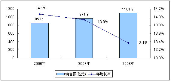 - 2008年銷(xiāo)售額達(dá)到1101.9億元,與2007年市場(chǎng)規(guī)模相比,增長(zhǎng)13.4%