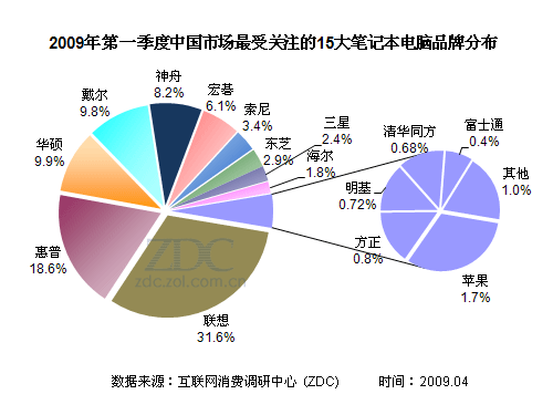 根據(jù)用戶的關(guān)注度狀況,ZDC統(tǒng)計(jì)出第一季度中國(guó)市場(chǎng)關(guān)注度最高的前十五大筆記本品牌。