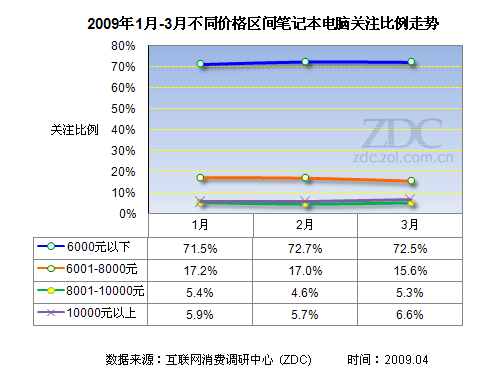 (圖) 2009年1月-3月不同價(jià)格區(qū)間筆記本關(guān)注比例走勢(shì)