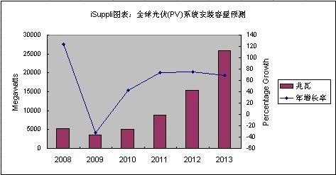 但是,2010年光伏安裝容量將會反彈,屆時增長率將回升到42.5%,2012和2013年將分別增長73.6%和68.6%。