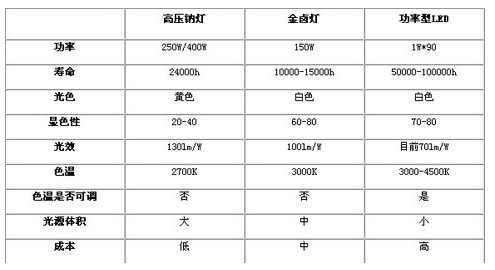 表 功率型LED與傳統(tǒng)道路照明光源的比較