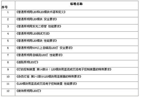 標(biāo)準(zhǔn)的目的在于加強(qiáng)生產(chǎn)的一致性、提升質(zhì)量、并增進(jìn)生產(chǎn)效率,若欲提升LED的制造質(zhì)量,在全球化的競(jìng)爭(zhēng)脫穎而出,標(biāo)準(zhǔn)是一項(xiàng)不可或缺的工具,因此加速對(duì)LED標(biāo)準(zhǔn)的制定是各國(guó)政府及業(yè)界非常重視的問(wèn)題。2007年在半導(dǎo)體照明標(biāo)準(zhǔn)工作指導(dǎo)委員會(huì)的指導(dǎo)下,由“國(guó)家半導(dǎo)體照明工程研發(fā)及產(chǎn)業(yè)聯(lián)盟”成立“聯(lián)盟標(biāo)準(zhǔn)化協(xié)調(diào)推進(jìn)工作組”,以負(fù)責(zé)協(xié)調(diào)中國(guó)的LED標(biāo)準(zhǔn)進(jìn)度。而目前最新進(jìn)展是由“全國(guó)照明電器標(biāo)準(zhǔn)化技術(shù)委員會(huì)”提出的普通照明用LED國(guó)家標(biāo)準(zhǔn)及行業(yè)標(biāo)準(zhǔn)等10多項(xiàng)標(biāo)準(zhǔn)目前都在送審階段,預(yù)計(jì)于今年陸續(xù)頒布實(shí)施,如表所示。