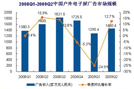 易觀國際分析認(rèn)為,由于部分細(xì)分市場尚未走出宏觀經(jīng)濟(jì)下滑的困境,加上整體市場的反彈并不強(qiáng)勁,因此本季度整體市場規(guī)模未達(dá)到去年同期的水平,預(yù)計(jì)目前中國宏觀經(jīng)濟(jì)的好轉(zhuǎn)對戶外電子屏廣告市場的促進(jìn)作用將在下半年顯現(xiàn)。