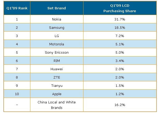 表一 2009年第一季手機(jī)品牌廠商按面板出貨量排名