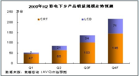 根據奧維咨詢(AVC)對三四級以及農村市場的理解和研究,結合下半年彩電業(yè)形勢,我們認為:隨著各省對家電下鄉(xiāng)工作的進一步開展以及彩電市場傳統(tǒng)旺季的到來,2009年第三、四季度,彩電下鄉(xiāng)規(guī)模將繼續(xù)保持較快速度增長,同時LCD產品的比重也將進一步增加,到第四季度,LCD產品銷量比重將占彩電下鄉(xiāng)市場的三分之一,銷售額比重將突破50%。