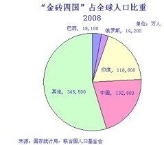 圖1:2008年金磚四國(guó)占全球人口比重。數(shù)據(jù)來(lái)源:中國(guó)國(guó)家統(tǒng)計(jì)局,聯(lián)合國(guó)人口基金會(huì)