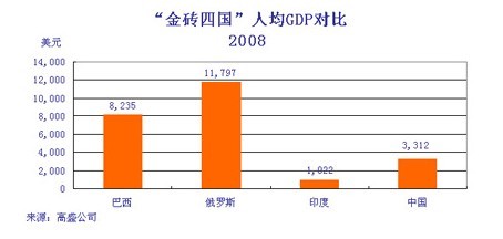 圖4:2008年金磚四國(guó)人均GDP對(duì)比。數(shù)據(jù)來(lái)源:高盛