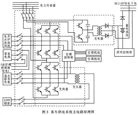 DC600V空調(diào)客車(chē)供電系統(tǒng)采用機(jī)車(chē)集中整流,客車(chē)分散逆變方式,構(gòu)成了整個(gè)列車(chē)的交一直一交變流供電系統(tǒng)。工作過(guò)程為:電力機(jī)車(chē)將25kV電網(wǎng)單相交流電降壓、整流、濾波成DC600V后給客車(chē)供電,客車(chē)根據(jù)用電設(shè)備的需要,將機(jī)車(chē)提供的DC600V變換成單、三相交流電及DC110V。系統(tǒng)采用兩套獨(dú)立供電。具有一定的冗余,客車(chē)供電的基本原理圖如圖3所示。