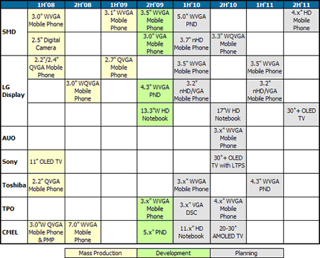 表一: 各家AMOLED制造商的產(chǎn)品生產(chǎn)計劃 (2008~2011)