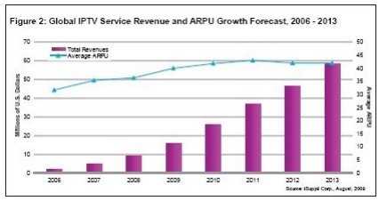 好消息是,在目前經(jīng)濟(jì)沉陷衰退之際,IPTV的好處已經(jīng)顯現(xiàn)出來(lái)。2008 年第四季度和2009 年第一季度,IPTV經(jīng)受住了經(jīng)濟(jì)衰退的沖擊,2009年有望增長(zhǎng) 56%,用戶數(shù)量增到 3330萬(wàn)個(gè)。2008年全球用戶數(shù)量是 2130萬(wàn)。