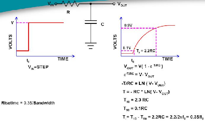 至此,我們知道帶寬f2即輸出電壓降低到輸入電壓70.7%時的頻率點(diǎn)。 根據(jù)放大器的等效模型,我們可進(jìn)一步推導(dǎo)示波器的上升時間和帶寬的關(guān)系式,即我們常提到的0.35的關(guān)系:上升時間=0.35/帶寬,推導(dǎo)過程如下圖6所示。 需要說明的是,0.35是基于高斯響應(yīng)的理論值,實(shí)際測量系統(tǒng)中這個數(shù)值往往介于0.35-0.45之間。在示波器的datasheet上都會標(biāo)明“上升時間”指標(biāo)。 示波器測量出來的上升時間與真實(shí)的上升時間之間存在下面的關(guān)系式。 在對快沿信號測試中,需要通過該關(guān)系式來修正實(shí)際被測信號的上升時間。