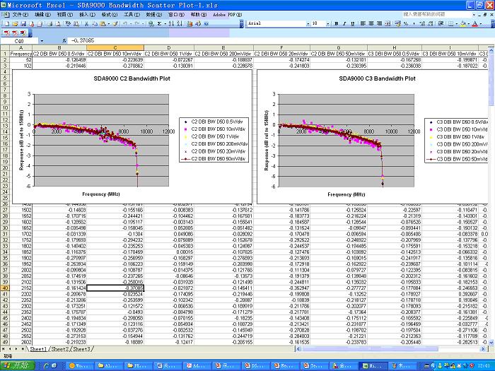 此外,在計(jì)量波特圖時需要對示波器每個檔位都進(jìn)行計(jì)量,最終產(chǎn)生的波特圖是所有檔位的結(jié)果疊加在一起的。波特圖的計(jì)量是需要半天時間完成的,并不是想象中那么輕松的工作。如圖8所示是力科SDA9000的波特圖,我特地將Excel中大量數(shù)據(jù)顯示給大家以使大家對校準(zhǔn)的嚴(yán)謹(jǐn)性有深刻認(rèn)識。 其垂直軸是-1dB/div, 疊加了10mv/div、20mv/div、50mv/div、200mv/div、500mv/div、1v/div等檔位的測試結(jié)果。 很多時候,我們的競爭對手會把他們的波特圖畫成-10dB/div、只有一個檔位的測試結(jié)果拿給客戶,并和力科提供的這種-1dB/div、各種檔位疊在一起顯示的結(jié)果放在一起進(jìn)行對比,然后他們告訴客戶,他們的波特圖更平坦,更干凈,甚至將力科波特圖上面密密麻麻的點(diǎn)說成是“噪音”大。這是有點(diǎn)貽笑天下的。 競爭對手敢于一再采用這種做法,這是假設(shè)中國的工程師都沒有辨別力,獨(dú)立思考能力,是對工程師嚴(yán)重不尊重的公然欺騙行為。希望能引起大家注意。
