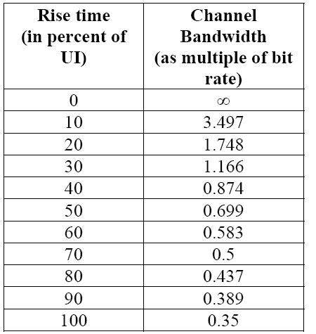 3, 對串行數(shù)據(jù)信號而言,數(shù)據(jù)比特率和上升時間是最重要的兩個因素。有一個非常好的評估準(zhǔn)則是:示波器的帶寬 > 1.8 X 信號比特率. 在這個準(zhǔn)則下,如果被測信號的上升時間>20%UI,那么1.8關(guān)系的帶寬能捕獲信號能量的99%. 下面的圖表給出了不同的上升時間和帶寬之間的關(guān)系。