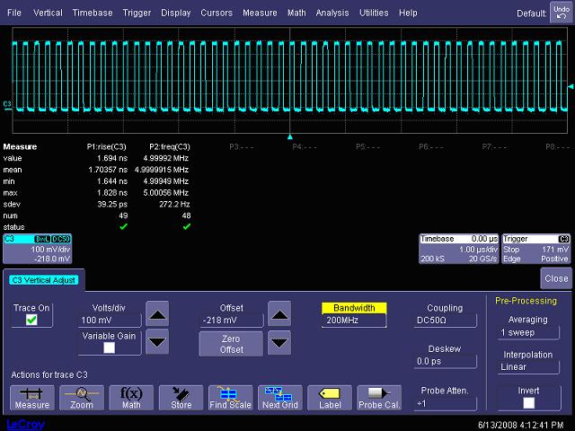 圖13,5MHz時鐘信號在6GHz、1GHz和200MHz等不同帶寬時的測試波形對比