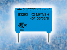 B3293*系列MKT薄膜電容器的電容范圍在0.1至10 µF之間,設計適用于標稱交流電壓為305V的環(huán)境,符合IEC 60384-14規(guī)則要求。最大工作溫度為105°C。電容達2.2 µF的各型號產品已通過X2安全認證(IEC 60384-14 / EN 60384-14)。