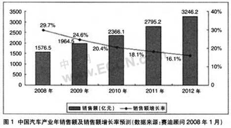中國(guó)汽車(chē)產(chǎn)業(yè)的繁榮直接帶動(dòng)了汽車(chē)電子產(chǎn)業(yè)的迅速崛起。中國(guó)汽車(chē)產(chǎn)業(yè)近幾年快速發(fā)展,2007年產(chǎn)量達(dá)到近888.24萬(wàn)部,僅次于日本和美國(guó),成為世界第三大汽車(chē)生產(chǎn)國(guó)。下游應(yīng)用市場(chǎng)的快速增長(zhǎng)對(duì)汽車(chē)電子產(chǎn)業(yè)的發(fā)展起到巨大的推動(dòng)作用。