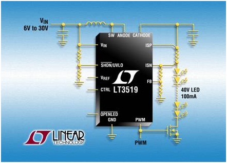 LT3519 在 LED 的高端檢測輸出電流,從而可實現(xiàn)降壓、降壓-升壓或升壓型配置。結(jié)合傳統(tǒng)電壓反饋和獨特的浮動電流檢測反饋,這些轉(zhuǎn)換器可以作為恒定電壓或恒定電流源工作,從而提供最大的設(shè)計靈活性。其它特點包括:開路 LED 保護、軟啟動和熱保護。
