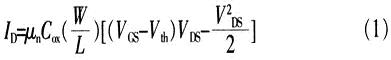 設(shè)置柵極寬度為W,有效柵極長(zhǎng)度為L(zhǎng),柵極下氧化層的厚度為tOX。MOS管的特性方程為: