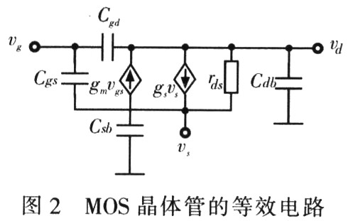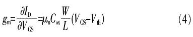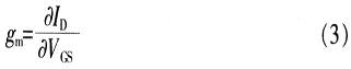 通過(guò)式(2)得到如圖2所示的MOS晶體管等效電路,其中壓控電流源gmVgs是模型中最重要的部分,晶體管的跨導(dǎo)gm定義為: