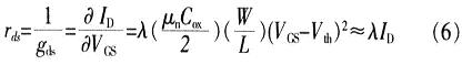 式中,γ是體效應(yīng)參數(shù),|2φF|為表面反轉(zhuǎn)電勢(shì)。圖2中,電阻rds表示有限輸出阻抗,模擬溝道長(zhǎng)度調(diào)節(jié)和漏極電流因Vds改變而引起的效應(yīng),由式(1)可得: