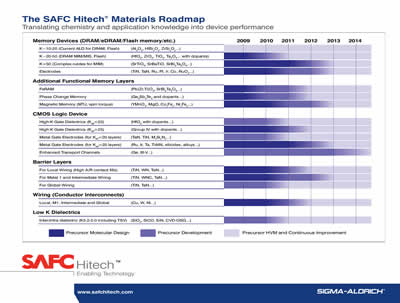 今年七月,在舊金山舉行的 Semicon West 展會(huì)上,我們針對(duì)硅半導(dǎo)體基底的化學(xué)氣相沉積 (CVD) 和原子層沉積 (ALD) 工藝公開(kāi)了新的材料發(fā)展規(guī)劃。 規(guī)劃(圖 1 )概述了當(dāng)前及未來(lái)先進(jìn)的存儲(chǔ)和邏輯設(shè)備的發(fā)展道路,包括阻擋層、互連、介電材料和金屬,我們預(yù)期逐步推出,直至 2014 年完成。