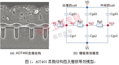 通常從外部來看,MOSFET是一個獨立的器件,事實上,在其內(nèi)部,由許多個單元(小的MOSFET)并聯(lián)組成,圖1(a)為AOT460內(nèi)部顯微結(jié)構(gòu)圖,其內(nèi)部的柵極等效模型如圖1(b)所示。MOSFET的結(jié)構(gòu)確定了其柵極電路為RC網(wǎng)絡(luò)。