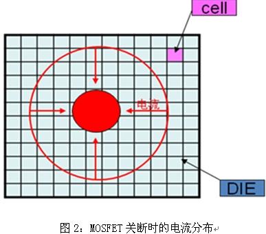 如果MOSFET所加的負載為感性負載,由于電感電流不能突變,導致流過MOSFET的電流向晶元的中間流動,如圖2所示。這樣就會造成MOSFET局部單元過熱而導致MOSFET局部單元損壞。如果加快MOSFET的關(guān)斷速度,以盡量讓MOSFET快速關(guān)斷,不讓能量產(chǎn)生集聚點,這樣就不會因局部單元過熱而損壞MOSFET。注意到:MOSFET的關(guān)斷過程是一個由穩(wěn)態(tài)向非穩(wěn)態(tài)過渡的過程,與此相反,MOSFET在開通時,由于負載的電流是隨著單元的逐漸開通而不斷增加的,因此是一個向穩(wěn)態(tài)過渡的過程,不會出現(xiàn)關(guān)斷時產(chǎn)生的能量集聚點。