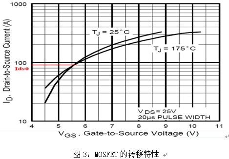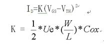 圖3為MOSFET處于飽和區(qū)時漏極電流ID與柵極電壓VGS的關(guān)系曲線即轉(zhuǎn)移特性,用公式可表示為: