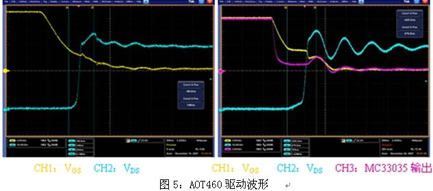 圖4是電動車控制器的兩種驅(qū)動MOSFET管AOT460驅(qū)動電路,分立器件驅(qū)動時,PWM在上橋臂,直接用MC33035驅(qū)動時,PWM在下橋臂。