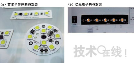 對于備受關注的高效照明——LED,能夠利用交流電源的種類越來越受到重視(圖3)。這種類型的LED照明無需A-D轉(zhuǎn)換電路,有望實現(xiàn)照明的小型化。該類型的先驅(qū)者——韓國首爾半導體(Seoul Semiconductor)展出了新產(chǎn)品:功耗為1W等級的封裝好的產(chǎn)品。過去該公司一般提供2W/4W等級的大型封裝產(chǎn)品,此次展示是為了滿足市場對于小型、高易用性的1W級別產(chǎn)品的需求。該產(chǎn)品的發(fā)光效率為70~80lm/W,低于直流電源驅(qū)動的類型,但韓國首爾半導體表示:“到2010年,其效率將提高到與直流驅(qū)動產(chǎn)品相當?shù)某潭龋?00lm/ W以上)”。
